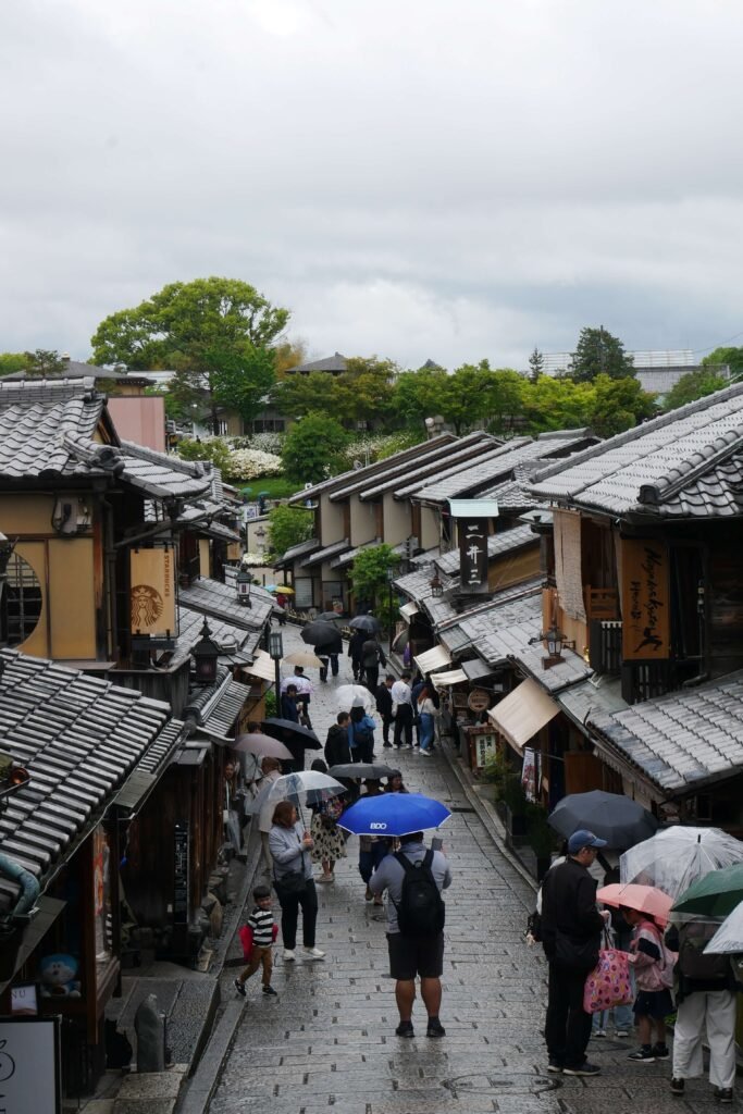 Une fois notre visite terminée, nous sommes redescendus pour explorer le quartier historique de Gion. Ce quartier est un quartier emblématique de Kyoto, ancien centre des geishas. Il a en quelque sorte conservé l’âme historique de Kyoto. Avec ses rues pavées, maisons traditionnelles en bois et boutiques artisanales, il nous transporte dans l’histoire du Japon. On passe ensuite par les incontournables rues Sannenzaka et Ninenzaka pour prendre des photos de carte postale avec la pagode Yasaka en fond. Ici, impossible d’éviter les foules de touristes, même sous la pluie. On a dû être inventifs pour prendre des photos sans trop de monde dessus.
